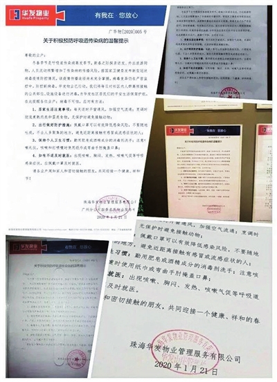 春節(jié)前夕,華發(fā)物業(yè)于1月21日推出公眾號文章《預(yù)防新型冠狀病毒,華發(fā)物業(yè)為您送上實用指南》,在為業(yè)主提供必要防護(hù)健康知識的同時,積極做好社區(qū)公共消毒,發(fā)布防疫資訊、為員工發(fā)放口罩等防護(hù)用品,幫助客戶、業(yè)主及員工進(jìn)行有效的預(yù)防工作。